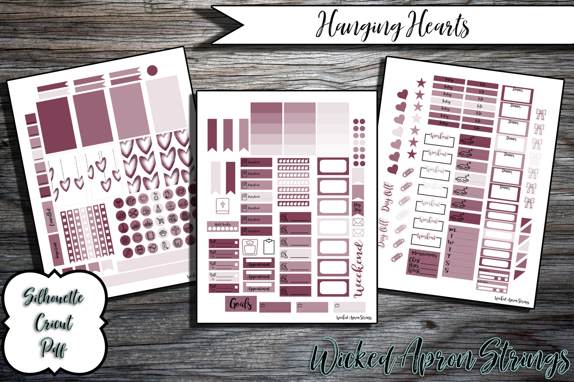 : February Combo Pack- Hanging Hearts : Printable Stickers for Classic Happy Planner Monthly and Weekly Planner Spread : Included is February Hanging Hearts + Hanging Hearts Weekly Planner Spread You will get cut files for both Silhouette and Cricut Machines, along with a PDF file for those that do not own a cutting machine. This is a digital product that is available as soon as payment is verified! You'll be using it within minutes! These items are created for the Classic Happy Planner. Download includes the following: - Silhouette Cut File - PNG File to be used with Cricut - PDF File for those that do not own a cutting machine. *This product is for personal use only* *It is a digital download - no physical items will be shipped* All files are made by Wicked Apron Strings