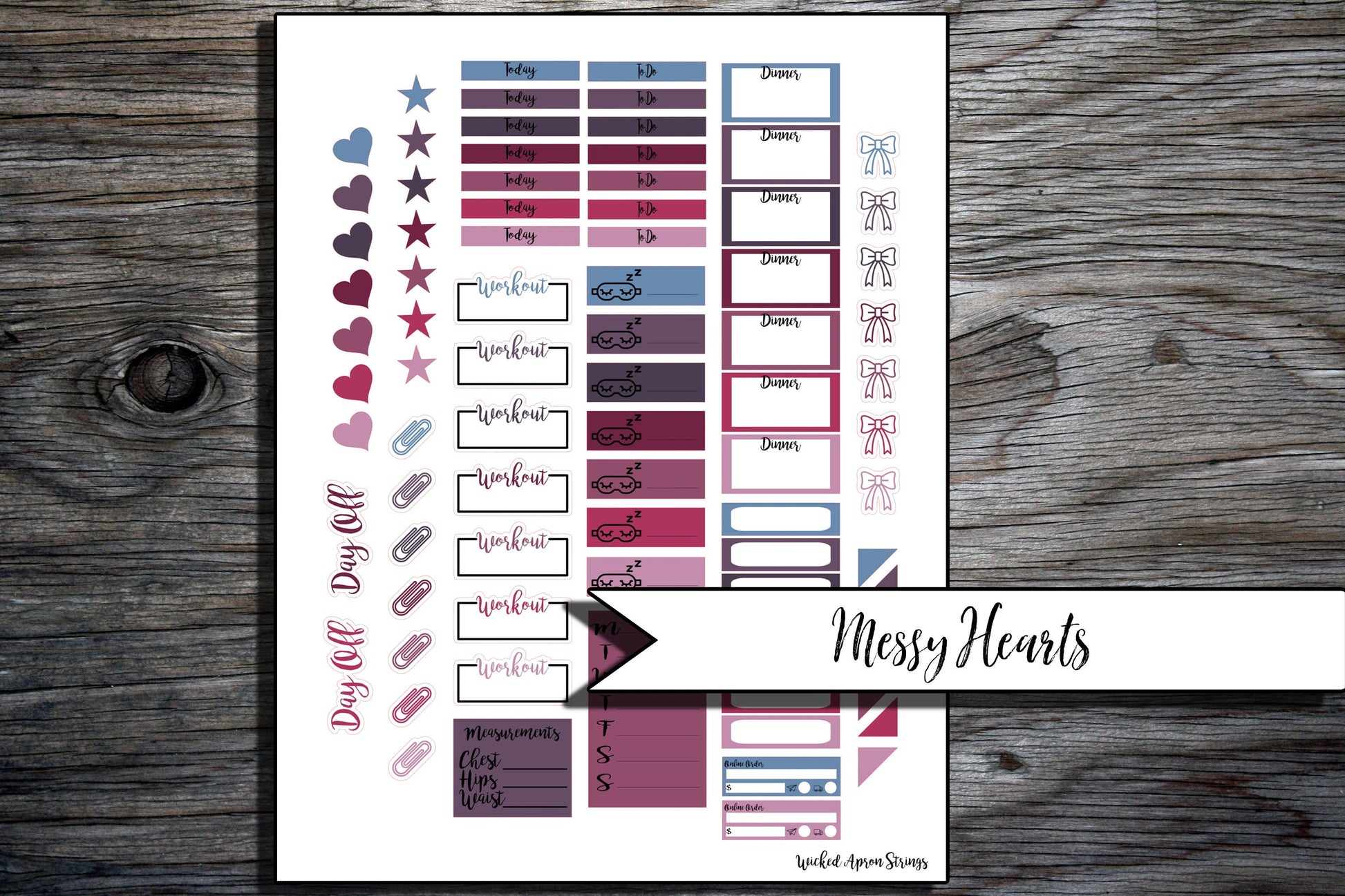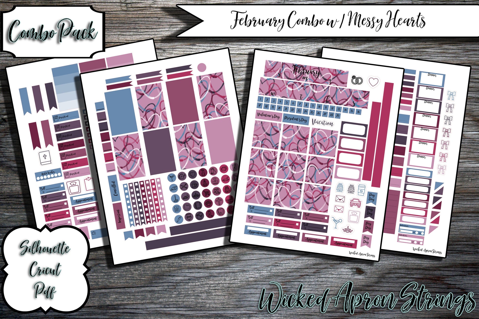 : February Combo Pack- Messy Hearts : Printable Stickers for Classic Happy Planner Monthly and Weekly Planner Spread :